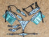MOSUM Western Leather Horse Tack Set - Headstall & Breast Collar Decorated with Turquoise & Royal Blue Butterfly Print, Turquoise Metallic Fringe