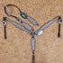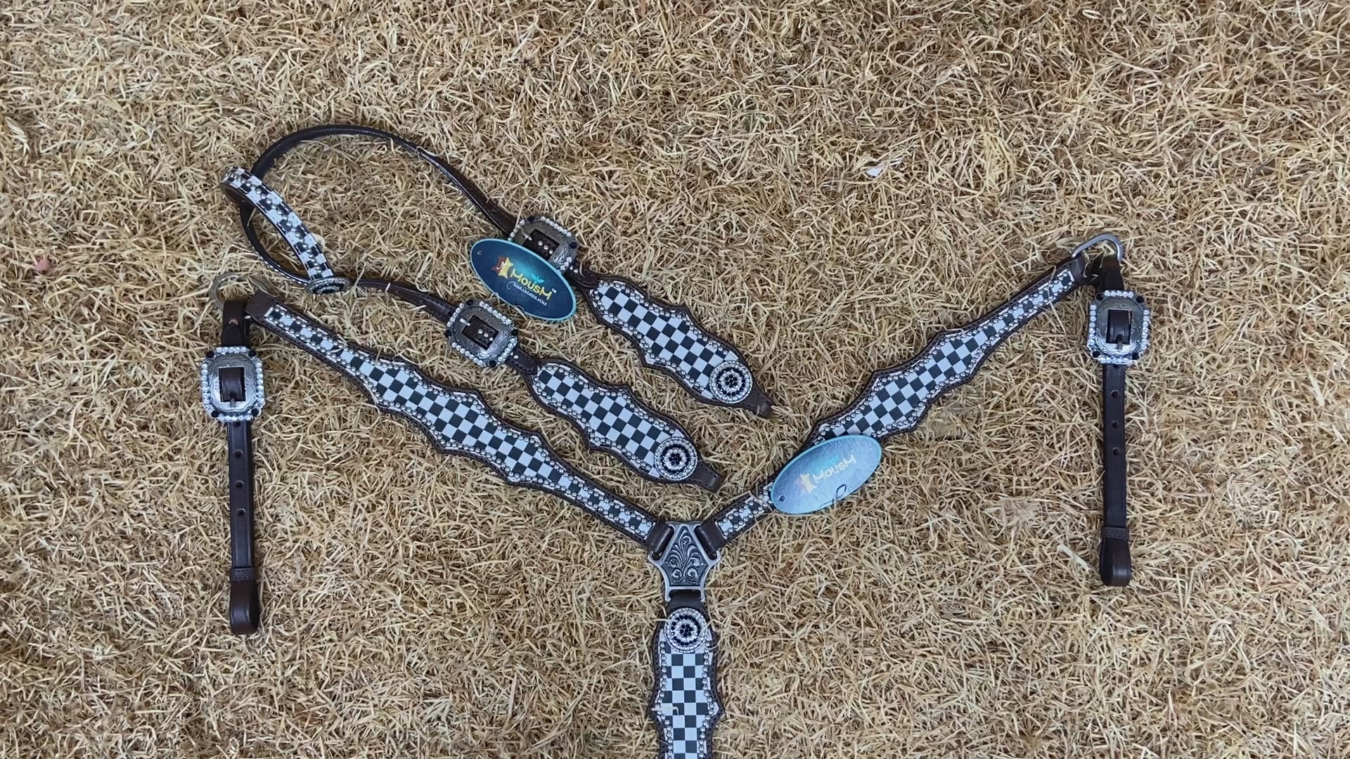 MOUSM presents Western Headstall and Breast Collar Set handcrafted from genuine Argentina cow leather, designed to deliver high performance and bold Western style. This One Ear Headstall Tack Set features a striking black and white checkered pattern, beautifully decorated with round rhinestone conchos surrounded by silver studs for added flair. Fitted with antique nickel hardware and copper rivet buckles, this headstall is built for durability and elegance. Feel like a race winner with the superior quality assurance of MOUSM craftsmanship.