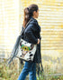 MOUSM handcrafted cowhide leather shoulder bag is a unique blend of rustic western style and vibrant charm. Featuring a real hair-on cowhide front panel with a colorful bull head print patch, long black leather fringe on both sides. This shoulder bag is designed to make a bold fashion statement. Ideal for women who appreciate artistic accessories with a touch of nature and boho flair.