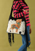 MOUSM handcrafted cowhide leather shoulder bag is a unique blend of rustic western style and vibrant charm. Featuring a real hair-on cowhide front panel with a colorful deer print patch, long black leather fringe on both sides. This lady's bag is designed to make a bold fashion statement. Ideal for women who appreciate artistic accessories with a touch of nature and boho flair.