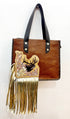This MOUSM handcrafted cowhide leather tote bag is a perfect blend of rustic charm and artistic detail. Made from genuine cowhide leather in a rich light oil brown tone, it features a beautifully carved and hand-painted patch of longhorn stag with floral detailing positioned at the corner of the bag. The piece is elevated by an elegant metallic gold fringe, adding a luxurious western flair.